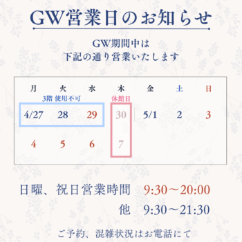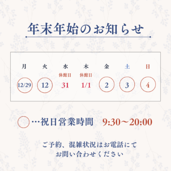 営業時間:平日・土 9:30~21:30(最終受付時間 20:00)/日祝 9:30~20:00(最終受付時間 19:00)